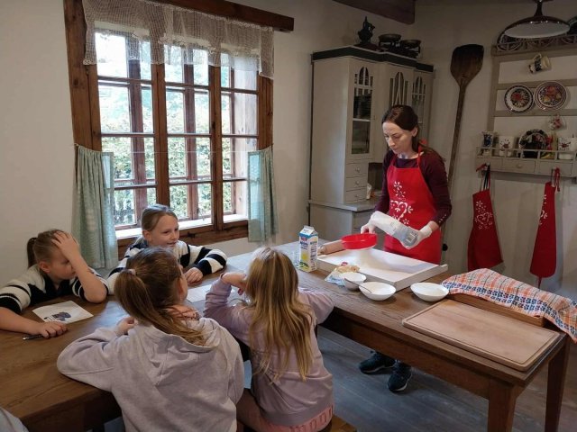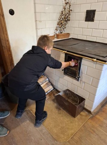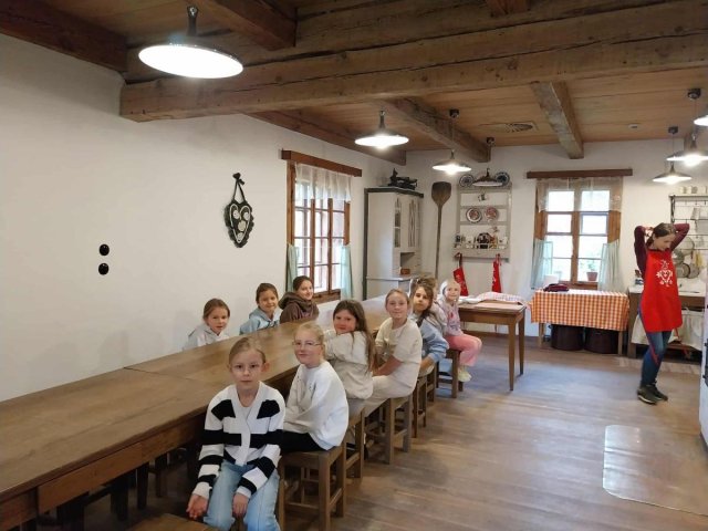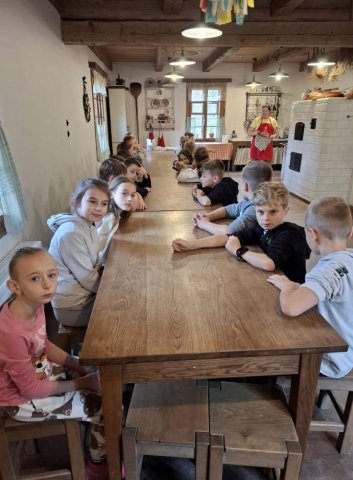Podczas wizyty w skansenie dzieci miały okazję przenieść się w czasie i zobaczyć, jak wyglądało życie na wsi ponad sto lat temu. Uczniowie zwiedzili drewniane chaty, stodoły i zabytkowy kościół, poznając dawne zwyczaje oraz codzienne zajęcia mieszkańców wsi rzeszowskiej i lasowiackiej. Pani przewodniczka w ciekawy sposób opowiadała o dawnych narzędziach, ubiorach i tradycjach.
