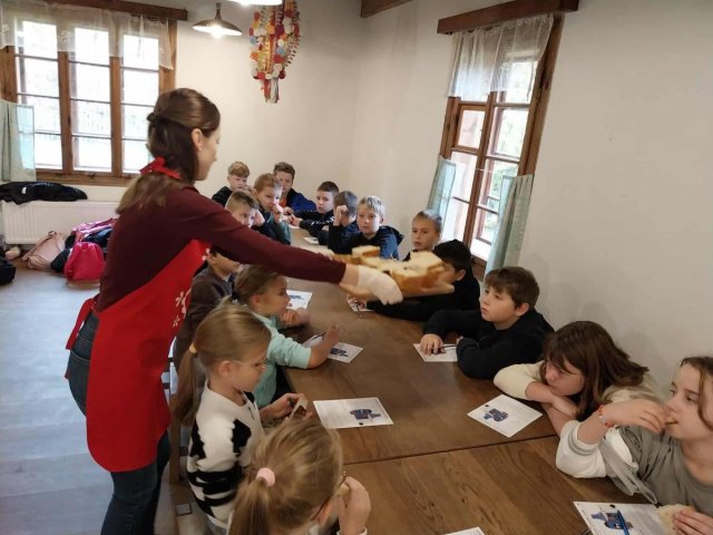 Jednym z najciekawszych punktów programu były warsztaty "Ziarnko do ziarnka... Bułka z masłem!". Uczniowie poznali drogę od ziarnka do chleba. Pod okiem prowadzącej dzieci samodzielnie wykrawały proziaki i piekły je na żeliwnej płycie. Kiedy pachnące placuszki były gotowe, każdy mógł ich spróbować z masłem. Smakowały wyśmienicie!