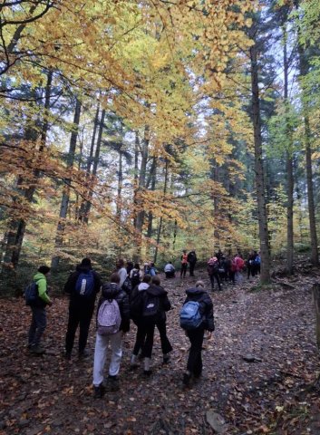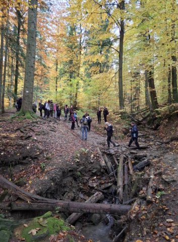 Startowaliśmy z Duszatyna, a już od pierwszych kroków wiedzieliśmy, że będzie to wyprawa, którą zapamiętamy na długo. Jesienne liście szeleściły pod nogami niczym kolorowy dywan, pogoda – mimo złowrogich prognoz o przelotnych deszczach – dopisała: ciepło, bezdeszczowo, a słońce od czasu do czasu wyglądało zza chmur, jakby chciało sprawdzić, czy na pewno dobrze się bawimy (a bawiliśmy się doskonale!).