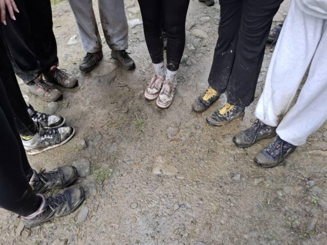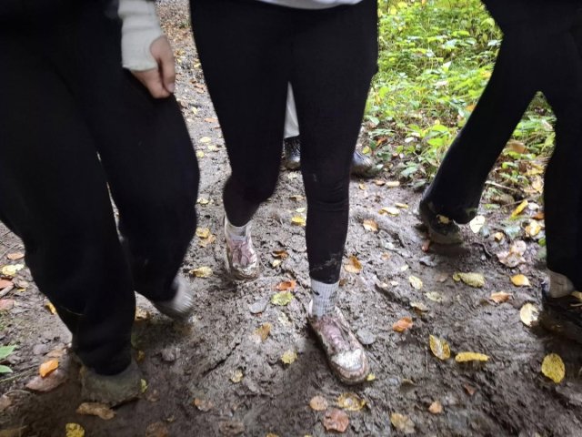 Największą atrakcją okazało się jednak… błoto. Dużo błota. Bardzo dużo błota. Ślizgaliśmy się na nim jak na nartach, zapadaliśmy po kolana, a czasem nawet głębiej. Zdarzało się, że buty znikały w czeluściach błotnistej otchłani, a ich wydobycie wymagało współpracy zespołowej na poziomie ratowników górskich. Błoto w butach, na butach, obok butów – wszędzie! Ale śmiechu było co niemiara, a humory – jak zawsze – dopisały.