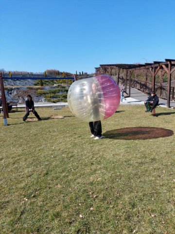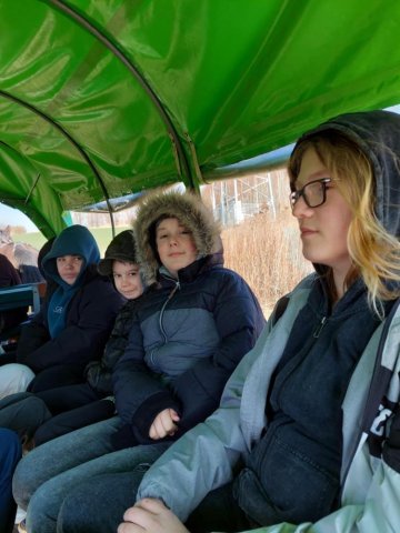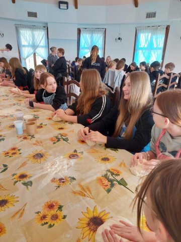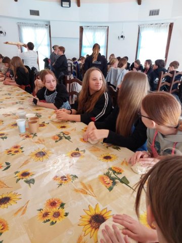 . Pogoda i humory wszystkim dopisały. Uczestniczyliśmy w warsztatach pieczenia chleba, dowiedzieliśmy się, jakie są etapy produkcji chleba od ziarna do gotowego bochenka. Samodzielnie przygotowaliśmy chlebki, które później zabraliśmy do domu. Wielkie emocje towarzyszyły zabawom z animatorem, mieliśmy okazję do rywalizacji- oczywiście zawsze fairplay. Przejażdżka bryczką była okazją do podziwiania pięknych krajobrazów, ale również świetnej zabawy- niektórzy realizowali swoje talenty wokalne. Inni prowadzili poważne rozmowy. Po takich atrakcjach i spaleniu mnóstwa kalorii udaliśmy się na posiłek- pieczone kiełbaski.