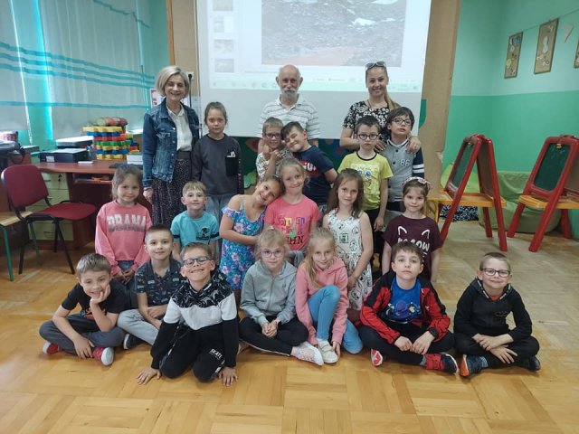 Dziś o swoich podróżach w różne zakątki świata, opowiedział im pan Wiesław Szczepanek. Dzieci z dużym zainteresowaniem wysłuchały ciekawych, ilustrowanych relacji, legend i ciekawostek. Poznały oznaczenia szlaków i nauczyły się je odnajdywać na mapach. Dowiedziały się co podróżnik musi koniecznie zabrać na wyprawę. Na koniec pan Wiesław zaprosił wszystkich na pieszy rajd po naszej okolicy. Bo zdobywanie wysokich szczytów trzeba od czegoś zacząć.
