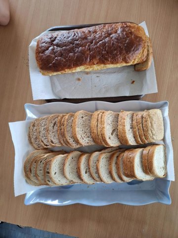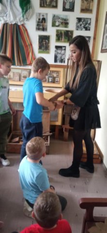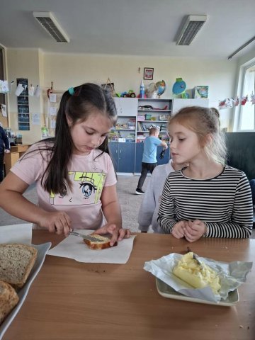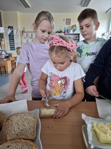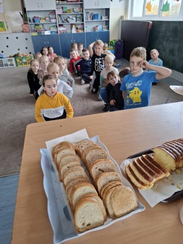 Pani Ania i pani Monika zaprowadziły je do szkolnej Izby Regionalnej, gdzie mogły "przenieść się w czasie" i zobaczyć, czym i jak dawniej pozyskiwano mąkę na chlebek. Dzieciaki mogły też skosztować świeżutkiego chleba pszennego, razowego z masełkiem, a także pysznego ciasta drożdżowego przygotowanego przez Babcię Mai, której bardzo dziękujemy! Pysznie było! /A.D. i M.K/
