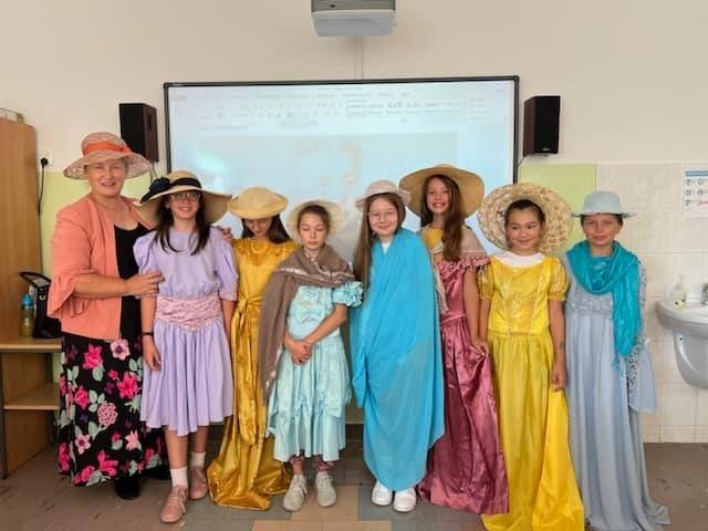 8 września 2023 r. podczas lekcji nakreślono czasy zaborów oraz zrywów niepodległościowych. Zwrócono uwagę na powstanie styczniowe, gdyż Eliza Orzeszkowa bezpośrednio się w nie zaangażowała (rola kuriera i ukrywanie powstańców). Echa represji zaborców względem Polaków pisarka zawarła w powieści pt. „Nad Niemnem”. Celem urozmaicenia zajęć i przeniesienia w czasy XIX wieku była możliwość ubrania sukienek czy kapeluszy z epoki. Mapa geograficzna z biegiem tytułowej rzeki, duże puzzle o rozbiorach ziem Polski stanowiły dopełnienie lekcji. Wspólnie przeczytano fragment powieści „Nad Niemnem”. Szczegółowe opisy przyrody oraz ludzi, słownictwo i dawny styl mówienia przeniosły uczniów w minione czasy. Na zdjęciach są uczniowie klas: 4a, 5c, 6a i 7a. /Bożena Nowacka/ |