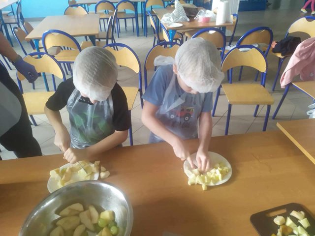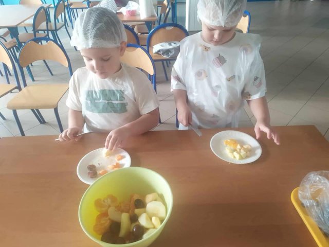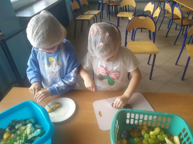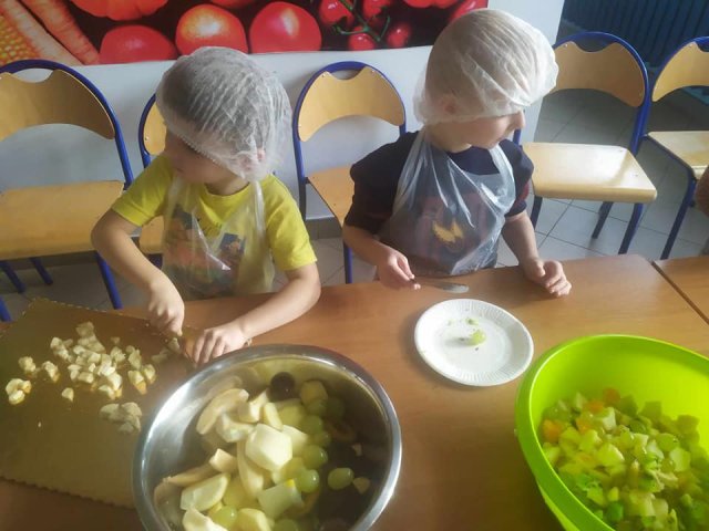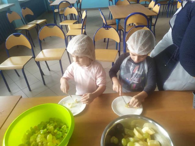 20 października 2023 roku w oddziałach zerowych obchodziliśmy Światowy Dzień Owoców i Warzyw. Zajęcia były „Kolorowe, piękne, pachnące…”, uczyły logicznego myślenia, rozwijały umiejętności klasyfikowania obiektów, dostrzegania podobieństw i różnic. Przyniesione przez dzieci warzywa wzbogaciły kąciki przyrodnicze. Zaś przyniesione owoce stały się głównym składnikiem pysznych i kolorowych sałatek, szaszłyków.