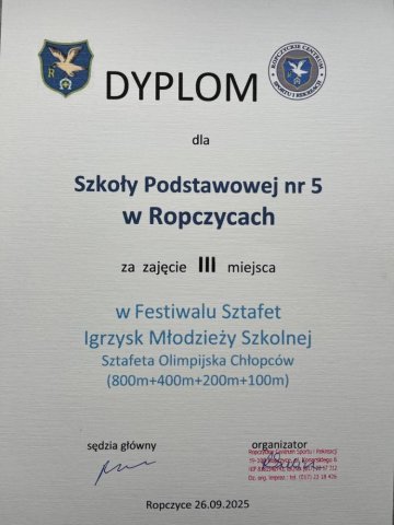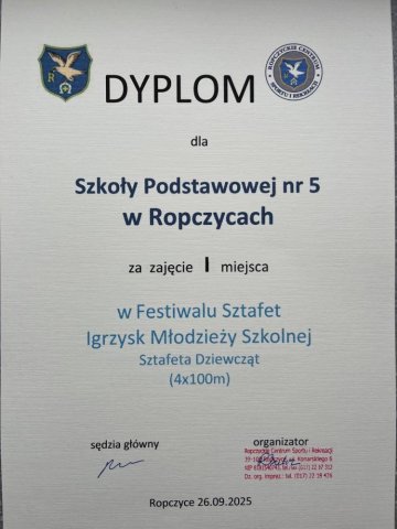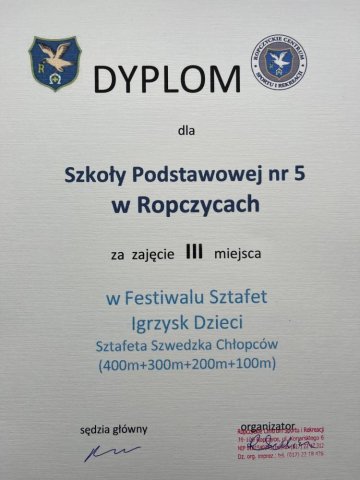 Igrzyska Młodzieży Szkolnej I miejsce Sztafeta 4x100m dziewcząt w składzie: Natalia Kozubowska 8b, Zofia Dąbal 8b, Dominika Ochał 8b, Kamila Frysztak 7a. III miejsce Sztafeta Olimpijska dziewcząt w składzie: Julia Bujak 7b, Anna Kasprzycka 7b, Wiktoria Żuczek 8b, Laura Radek 7a. III miejsce Sztafeta Olimpijska chłopców w składzie: Adrian Cabaj 8b, Illia Dovhaliuk 7a, Adam Dąbal 7b, Mikołaj Wawro 8b. Igrzyska Dzieci III miejsce Sztafeta Szwedzka chłopców w składzie: Bartłomiej Ciosek 6b, Antoni Świerk 6a, Dawid Nowak 6a, Jakub Pazdan 6b. |
