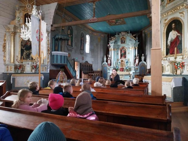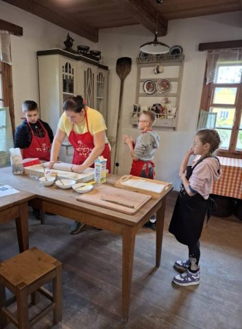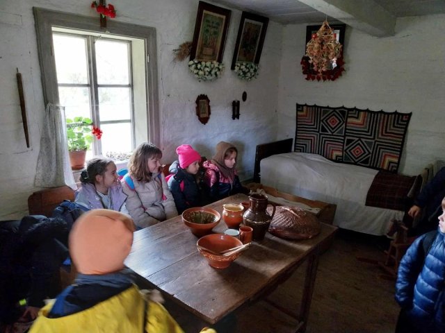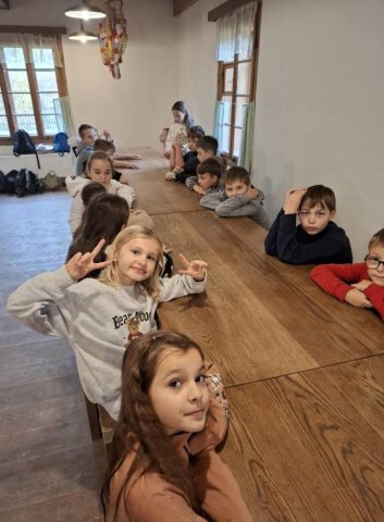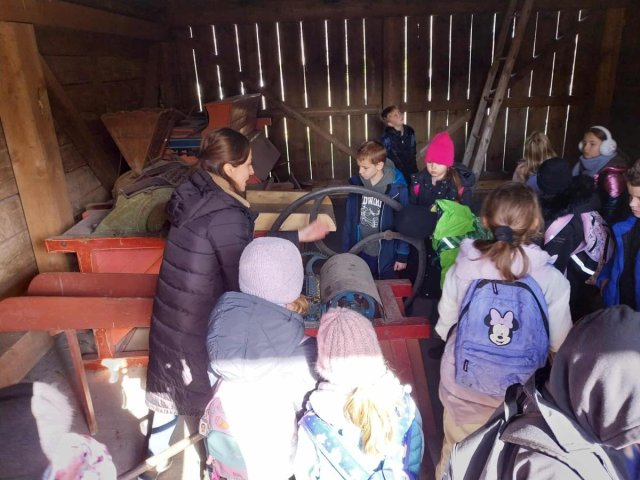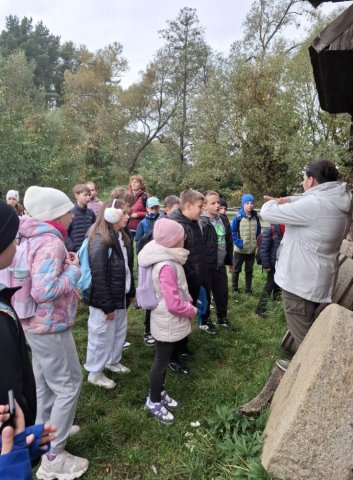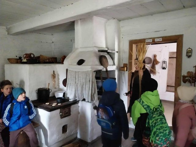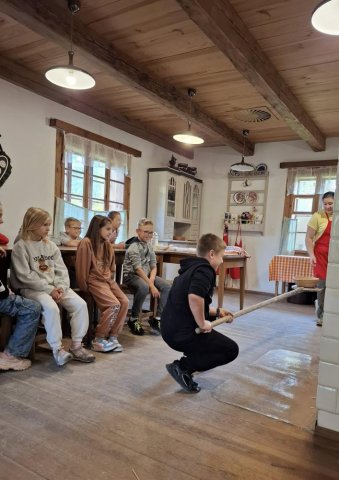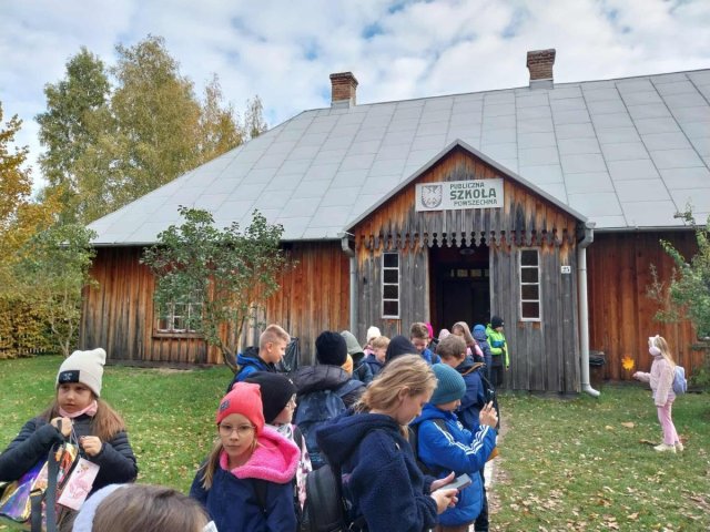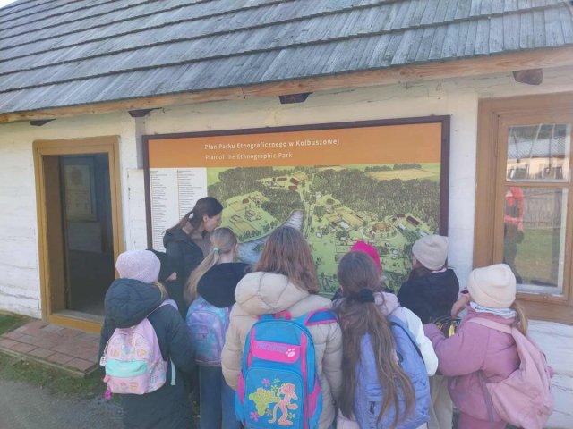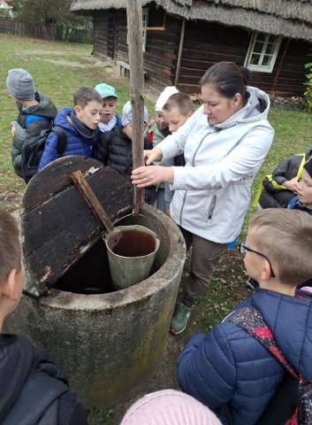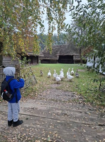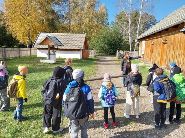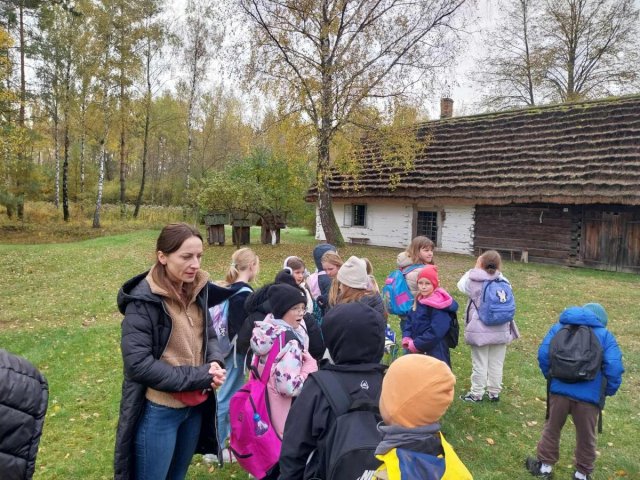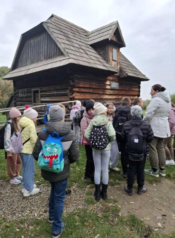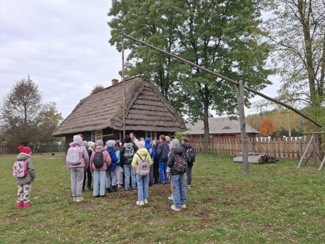 Podczas wizyty w skansenie dzieci miały okazję przenieść się w czasie i zobaczyć, jak wyglądało życie na wsi ponad sto lat temu. Uczniowie zwiedzili drewniane chaty, stodoły i zabytkowy kościół, poznając dawne zwyczaje oraz codzienne zajęcia mieszkańców wsi rzeszowskiej i lasowiackiej. Pani przewodniczka w ciekawy sposób opowiadała o dawnych narzędziach, ubiorach i tradycjach.