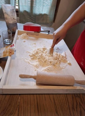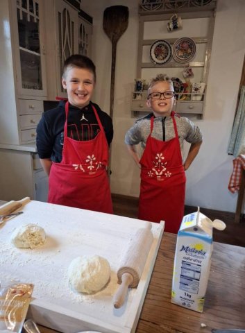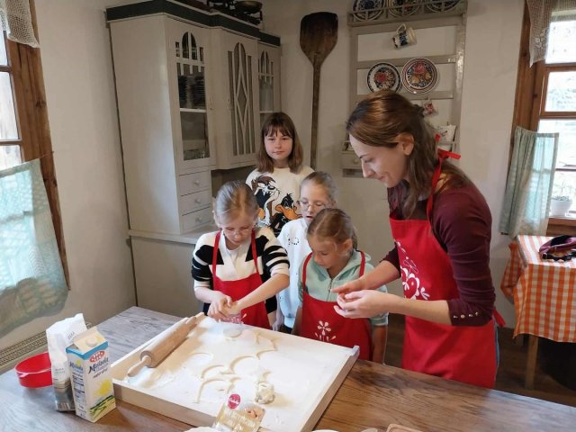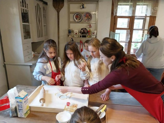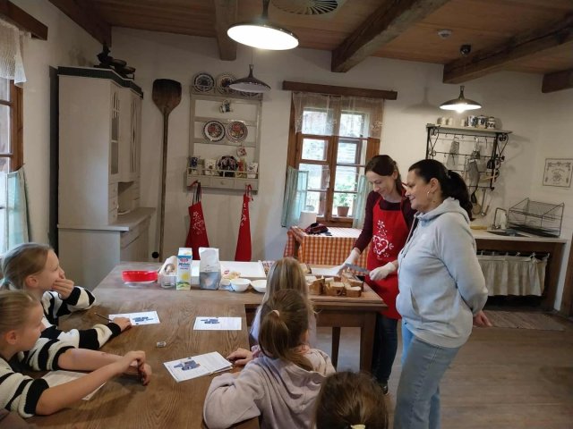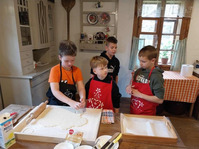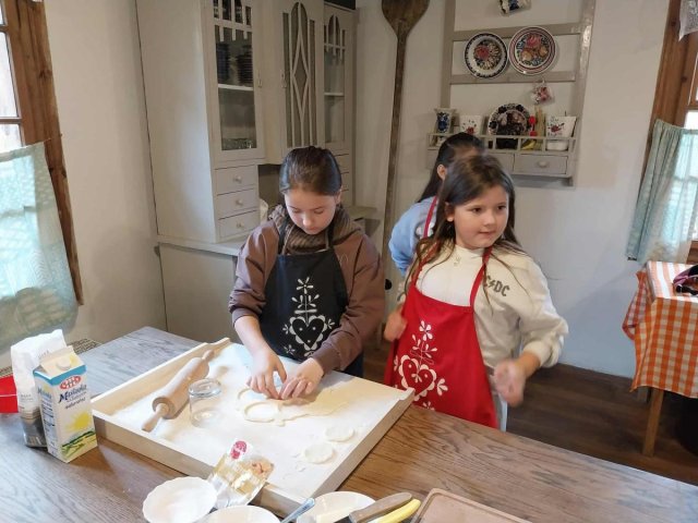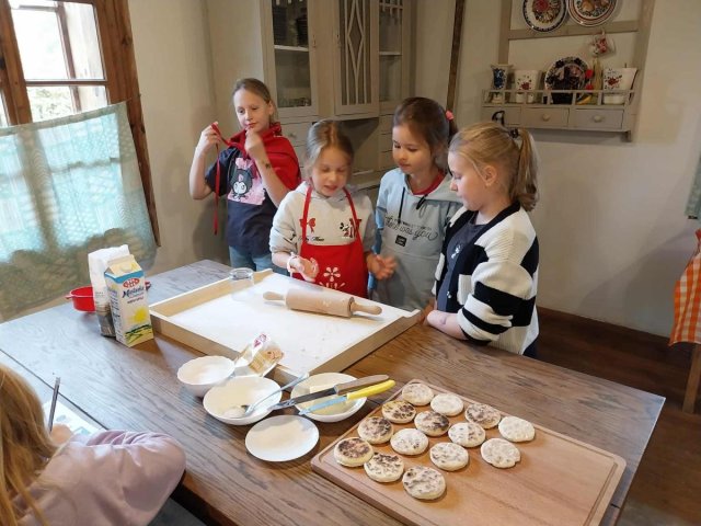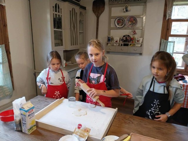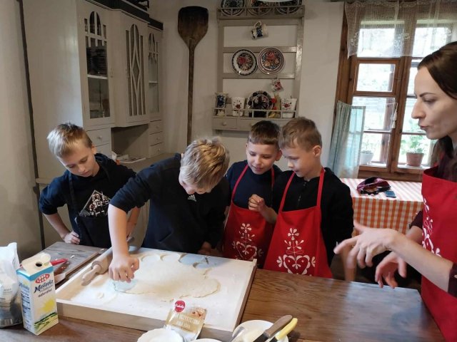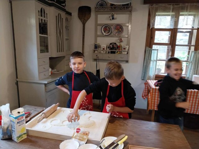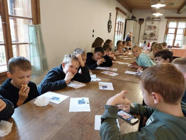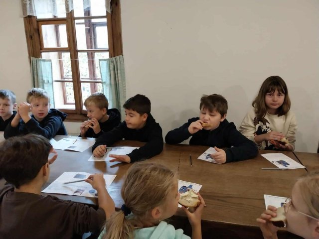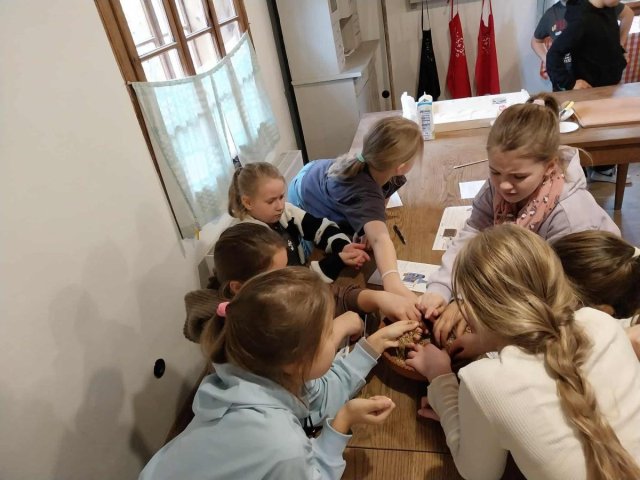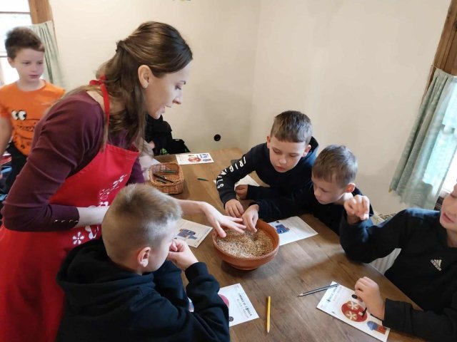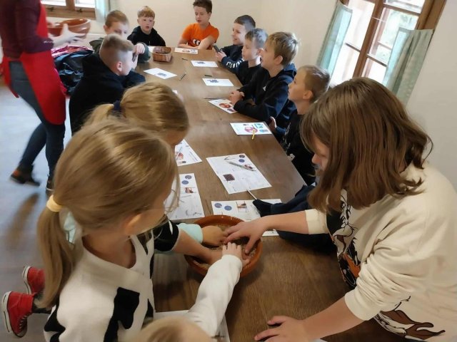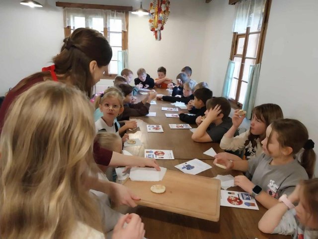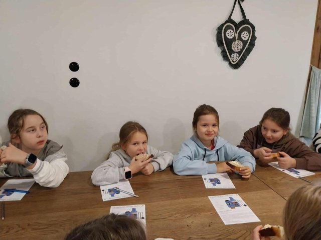 Jednym z najciekawszych punktów programu były warsztaty "Ziarnko do ziarnka... Bułka z masłem!". Uczniowie poznali drogę od ziarnka do chleba. Pod okiem prowadzącej dzieci samodzielnie wykrawały proziaki i piekły je na żeliwnej płycie. Kiedy pachnące placuszki były gotowe, każdy mógł ich spróbować z masłem. Smakowały wyśmienicie!