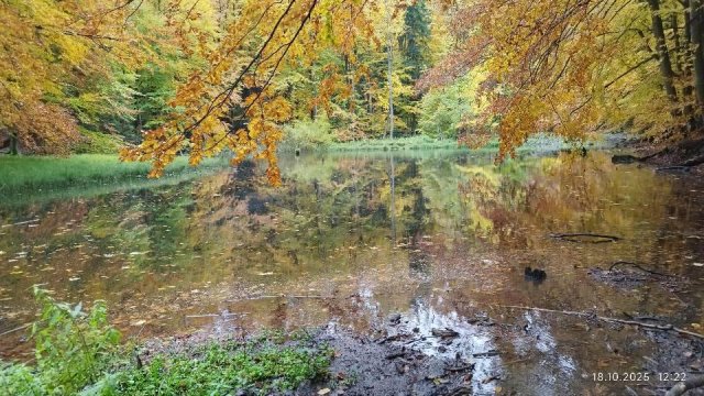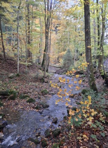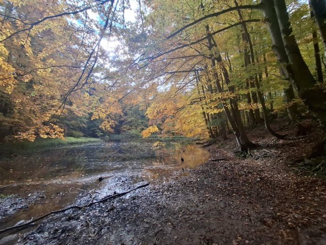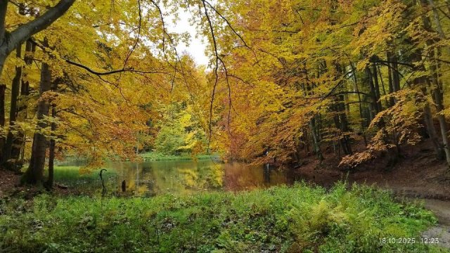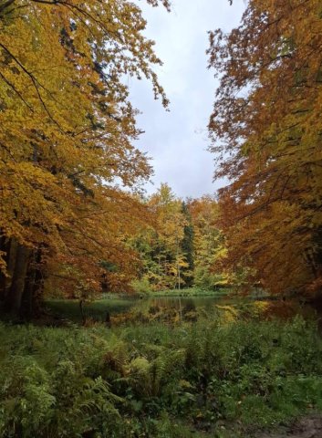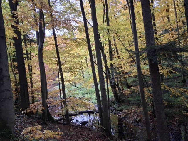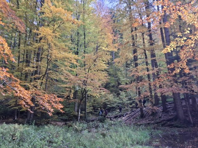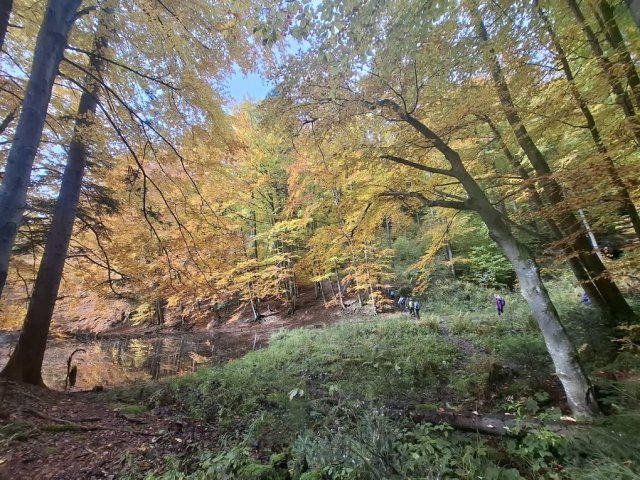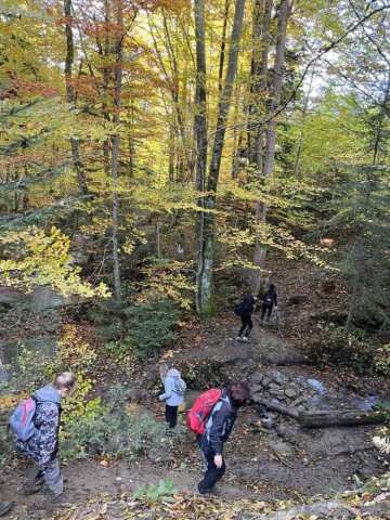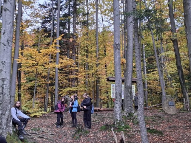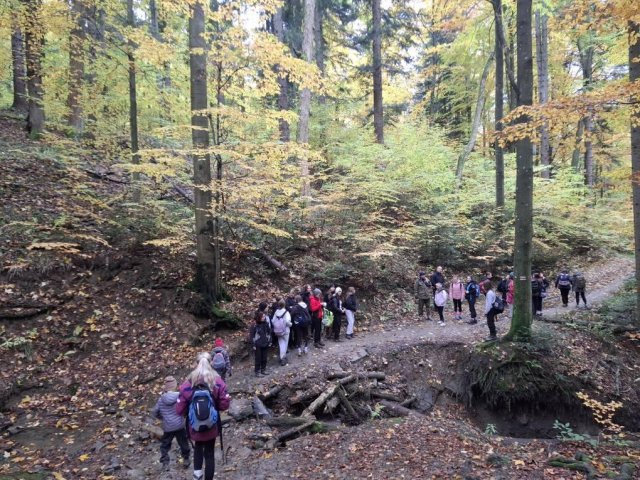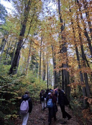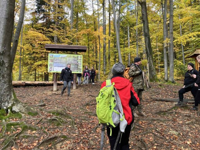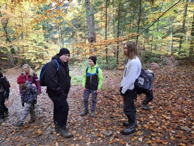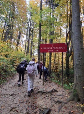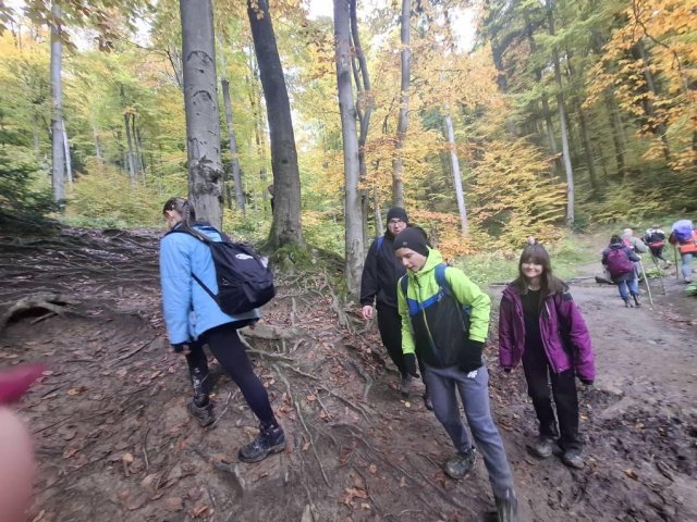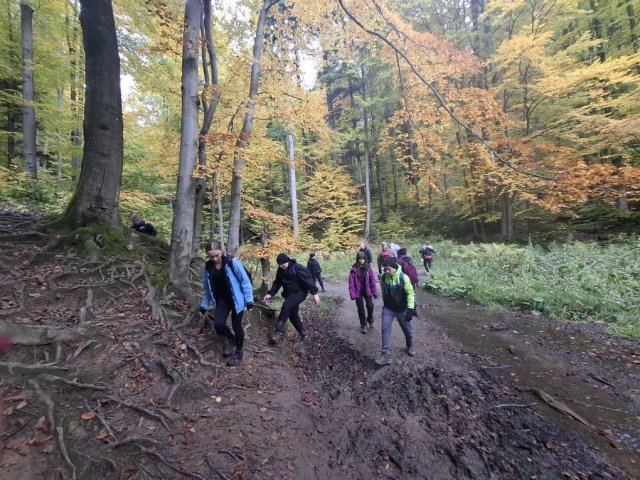 Startowaliśmy z Duszatyna, a już od pierwszych kroków wiedzieliśmy, że będzie to wyprawa, którą zapamiętamy na długo. Jesienne liście szeleściły pod nogami niczym kolorowy dywan, pogoda – mimo złowrogich prognoz o przelotnych deszczach – dopisała: ciepło, bezdeszczowo, a słońce od czasu do czasu wyglądało zza chmur, jakby chciało sprawdzić, czy na pewno dobrze się bawimy (a bawiliśmy się doskonale!).